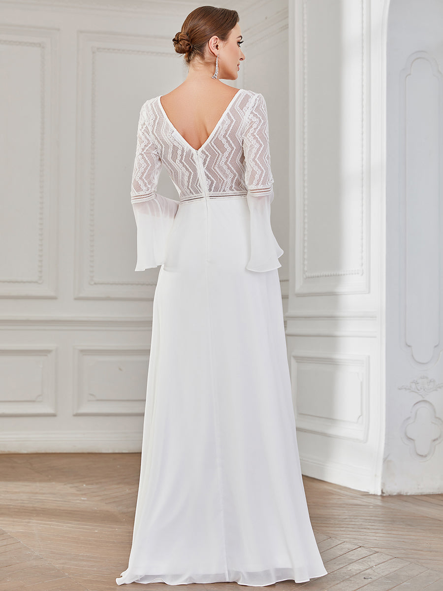 Enjoy your big day looking beautiful by wearing this adorable wedding dress. Featuring long sleeves, deep V-neck, and an A-line silhouette, this dress will look stunning.