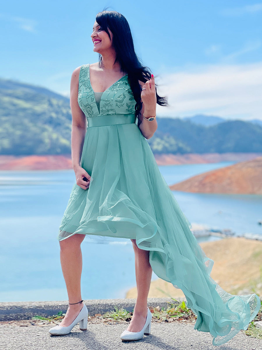 A true customer favorite! This gorgeous evening dress features a sexy double deep V neckline, a sequins lace bust and long high low silhouette which allows you to walk and dance all night long without tripping over your hem. This stunning evening dress is perfect for evening party, cocktail, prom, homecoming, graduation, weddings, and any other formal affair!