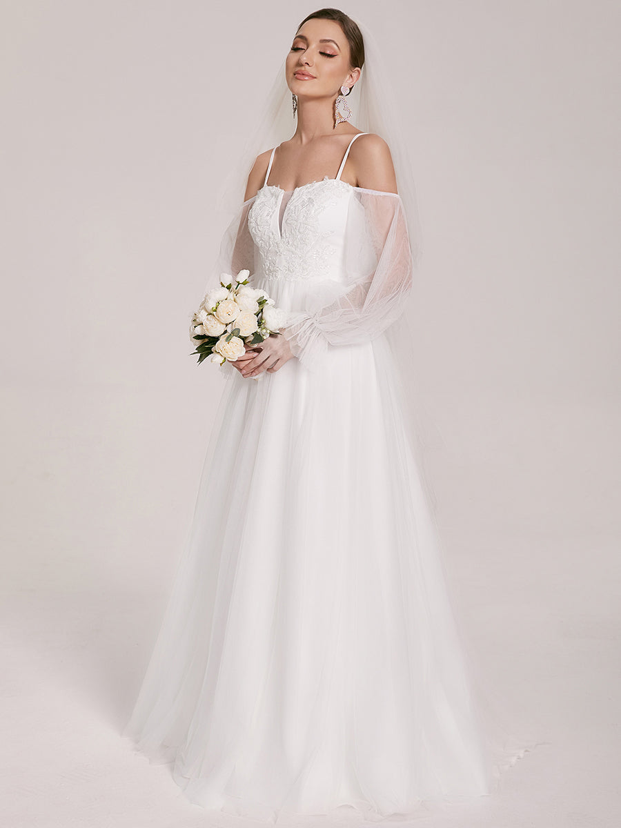 You don't need to find your perfect wedding dress because this wedding dress can be your dream dress. The beautiful dress features see-through lantern sleeves, deep V-neck, and an A-line silhouette. The floral applique designing below the neckline will surely take everyone's heart away.