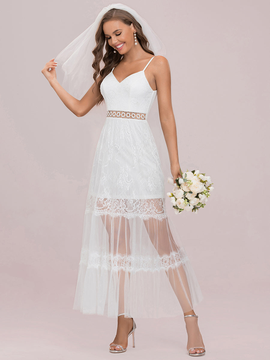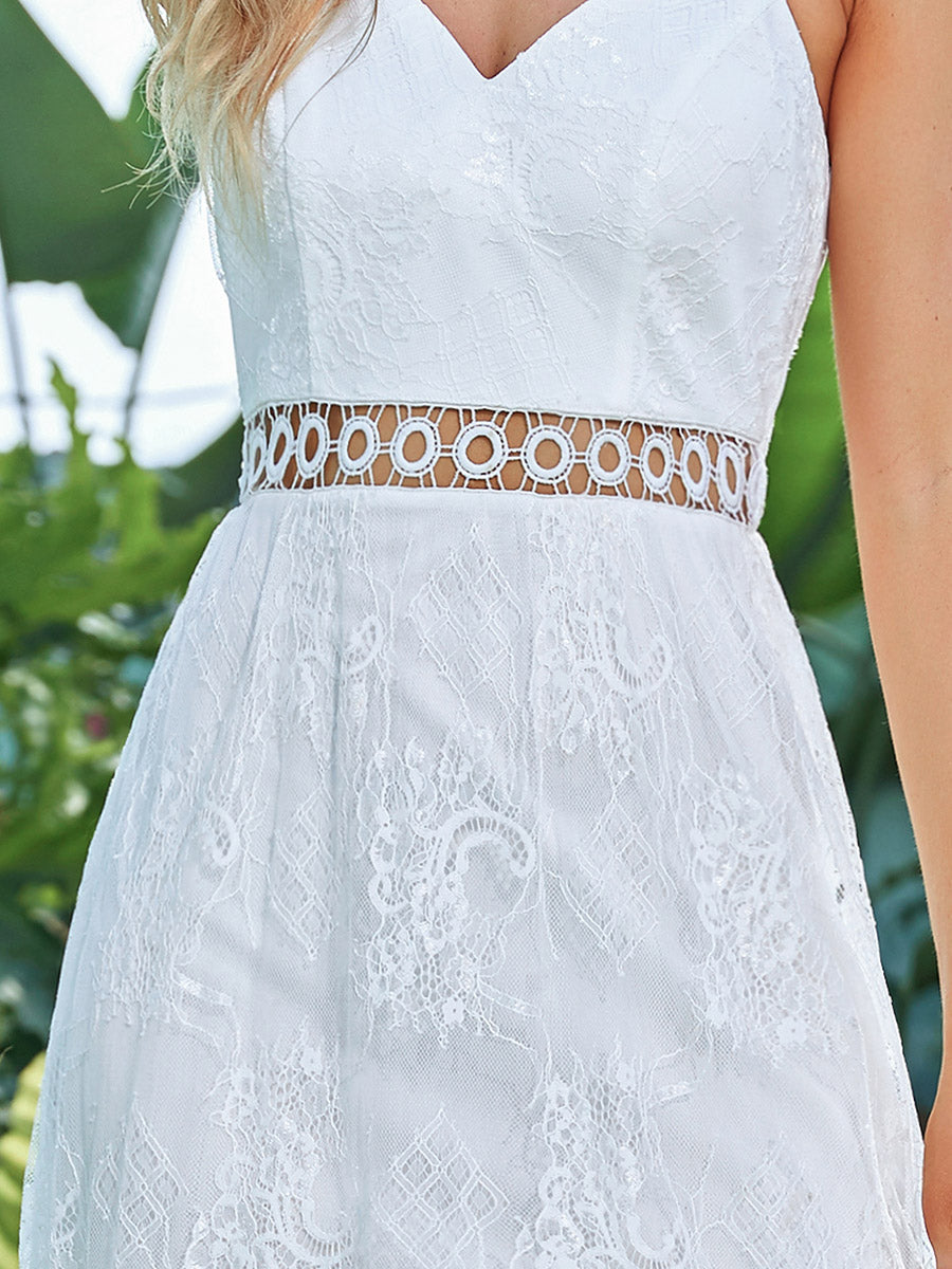 This cute and gorgeous wedding dress is sleeveless and has a deep V-neck. It is made of beautiful eyelash edge lace fabric and has a hollow out design on the waistline. This wedding dress will look so flattering on all body shapes.