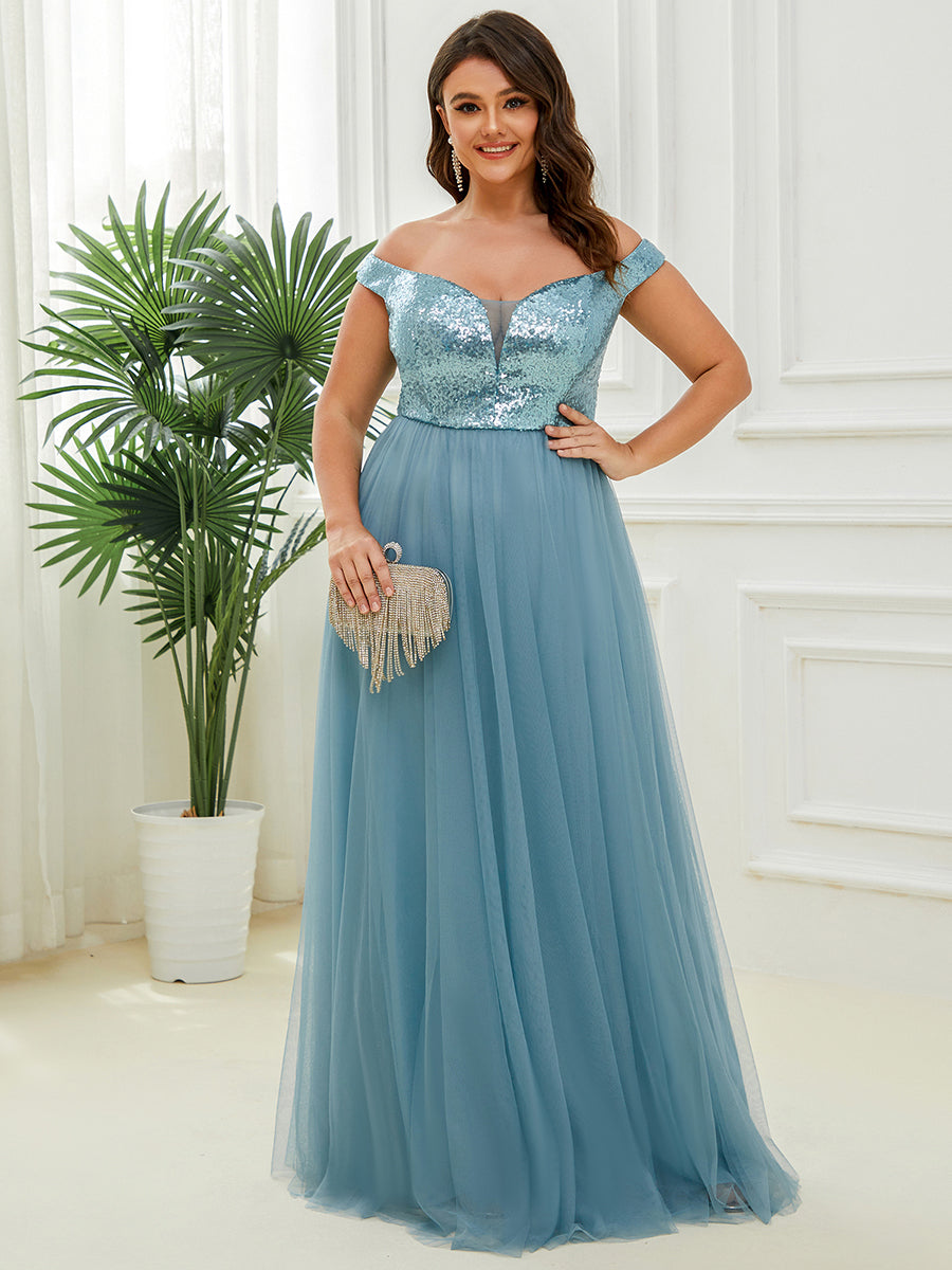 Do you want your customers to look the best? If yes, then this plus size evening dress should be in your shop. It features off-shoulders and has a deep V neck. The paillettes on the upper part of the dress look really adorable. The length of the dress extends to the floor and this is the type of dress that every customer has been looking for.