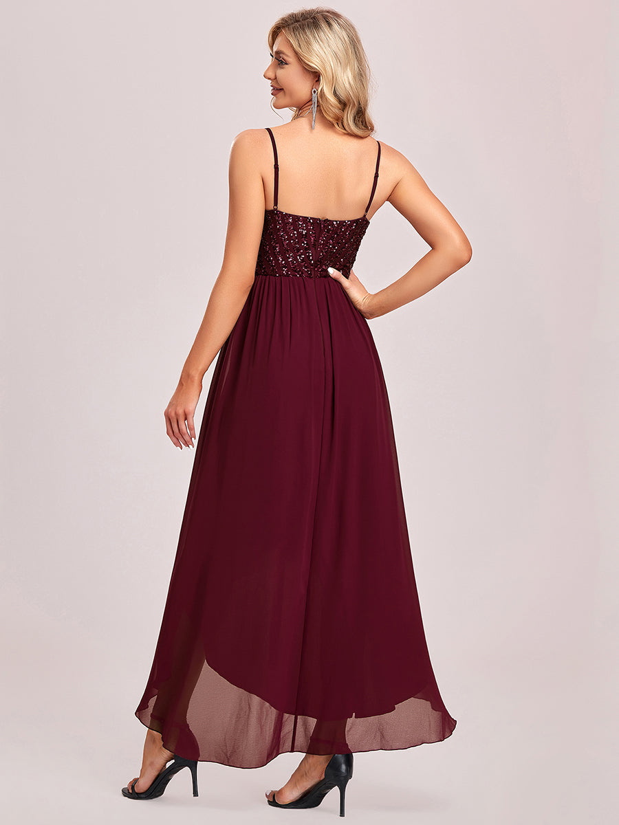 Look as gorgeous as a mermaid by wearing this magnificent evening dress. Featuring asymmetrical hem, sweetheart neckline and spaghetti straps, this evening dress will catch everyone's attention. The paillette designing on the bust area also looks quite enchanting.