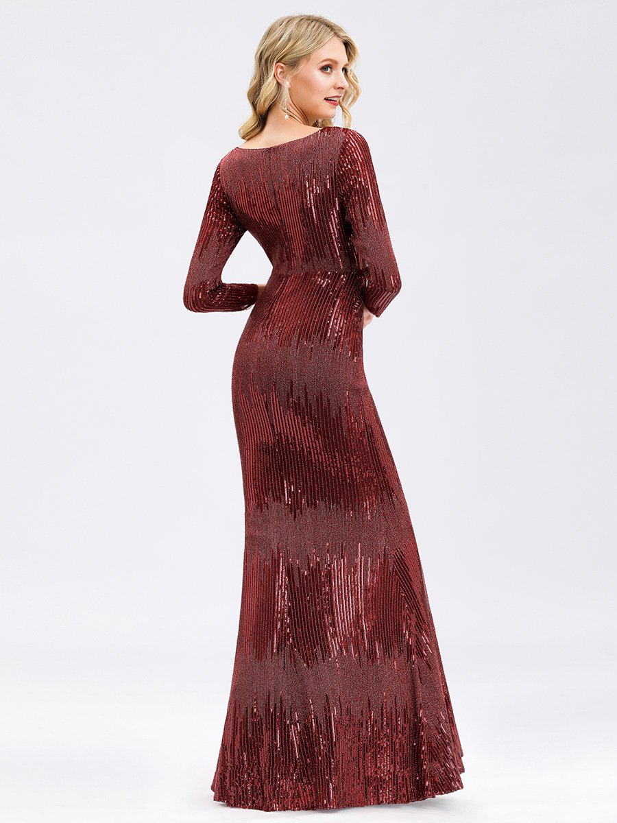 Featuring a deep V neckline, long sleeves and a fishtail skirt, this wholesale burgundy sequin dress is a perfect choice for dancing the night away! This gorgeous evening dress is perfect for evening party, cocktail, prom, homecoming, graduation, weddings, and any other formal affair!
