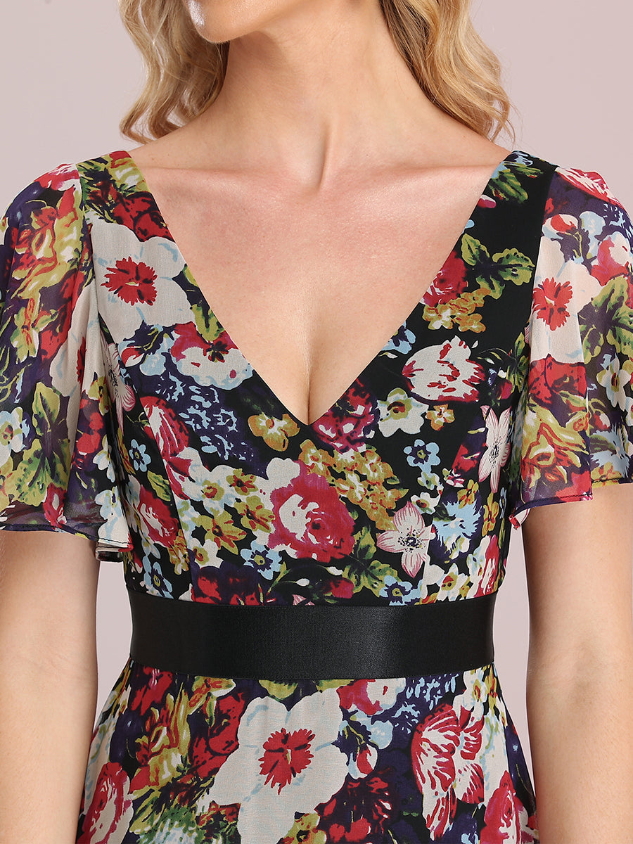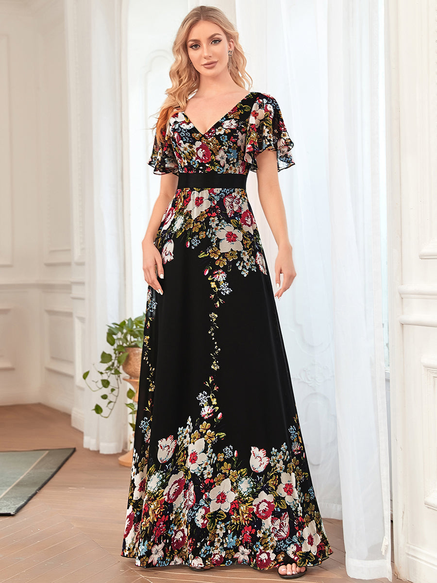 Our gorgeous and stunning floral print evening dress is the best dress for all evening occasions. This floor-length dress features a deep V-neck, short ruffles sleeves and an A-line silhouette. It also looks great from all sides.