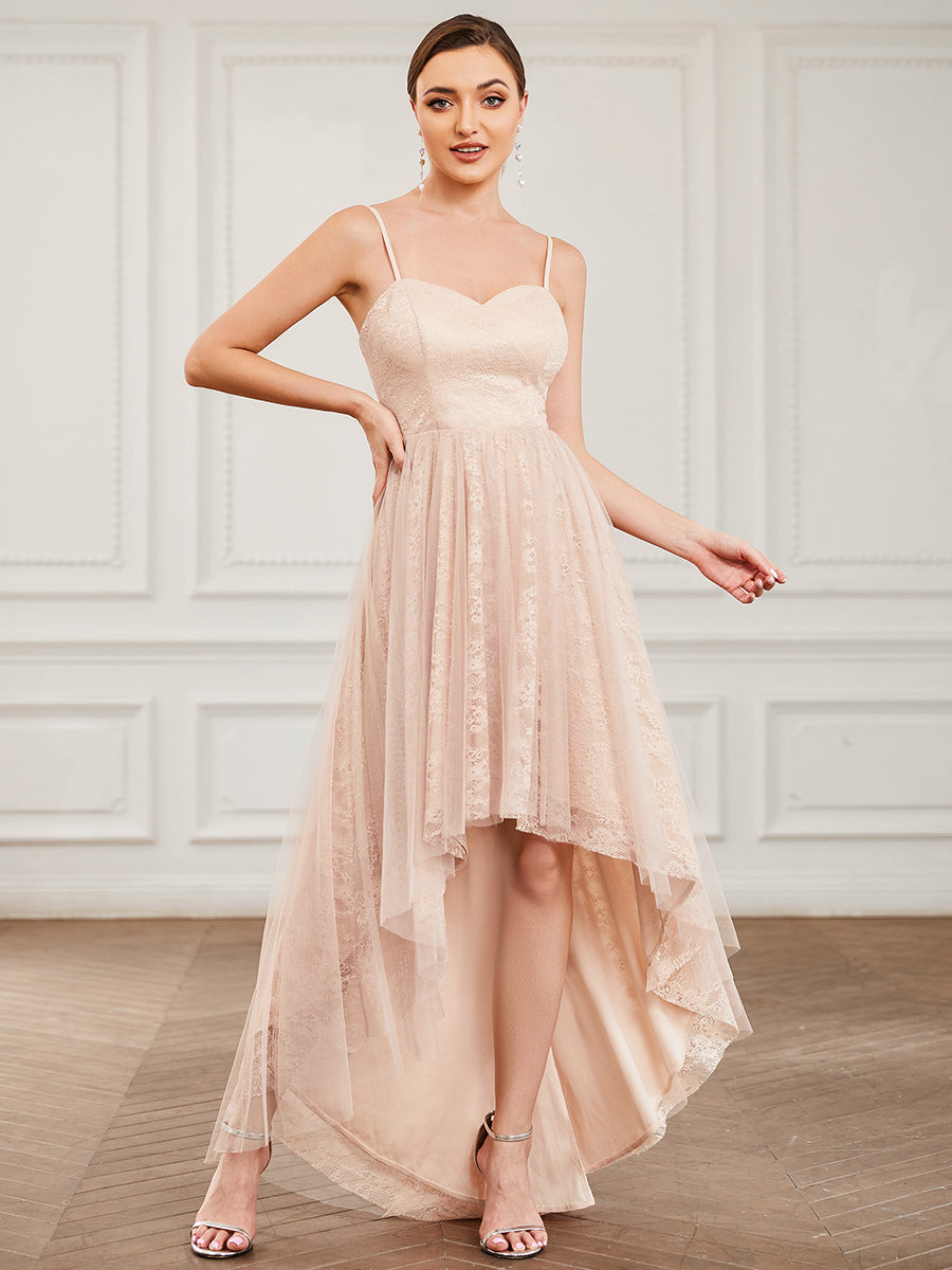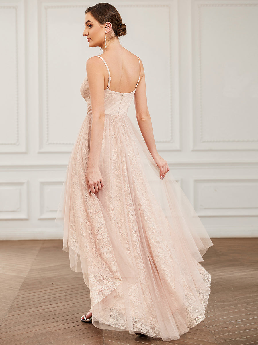Wear to look beautiful with this cute bridesmaid dress. It is designed with spaghetti straps, asymmetrical hem, deep V-neck and an A-line silhouette.