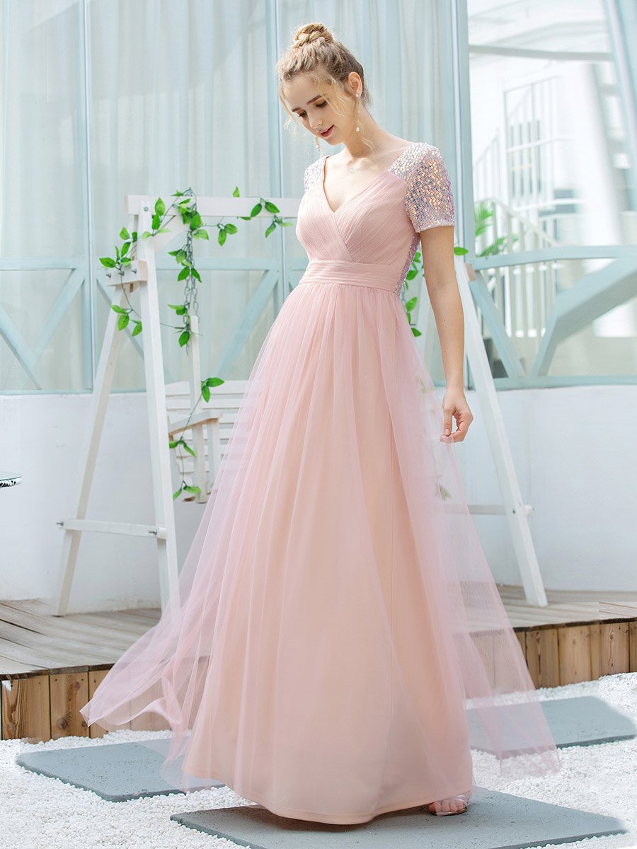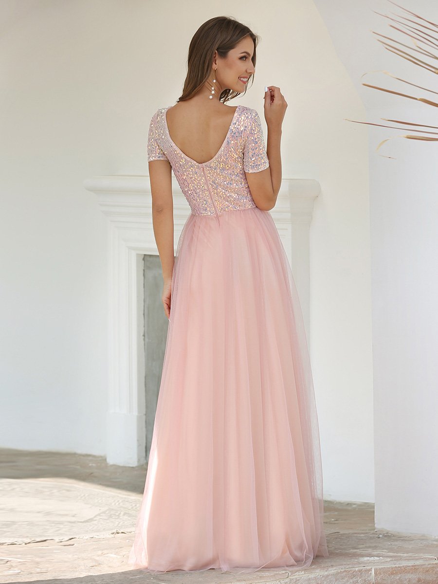 Live a day like a princess by wearing this adorable and feminine dress. You would look so gorgeous in it that everyone will treat you like a princess. This dress features deep V-neck and short sleeves. The sequined back with deep round neck looks utterly amazing. This pretty dress has an A-line silhouette and will compliment every body shape. A perfect choice for formal weddings and evening parties, cocktail, prom, homecoming, graduation, and any other formal affair!