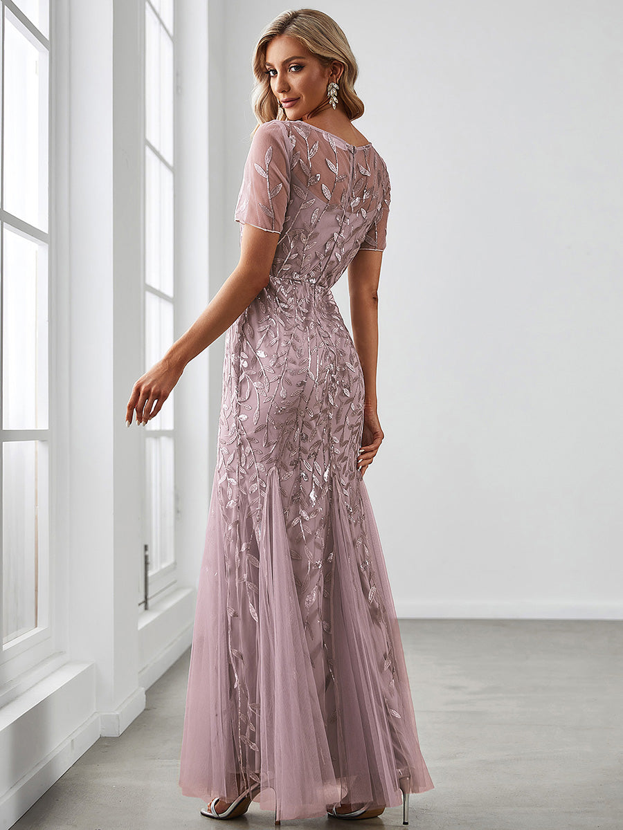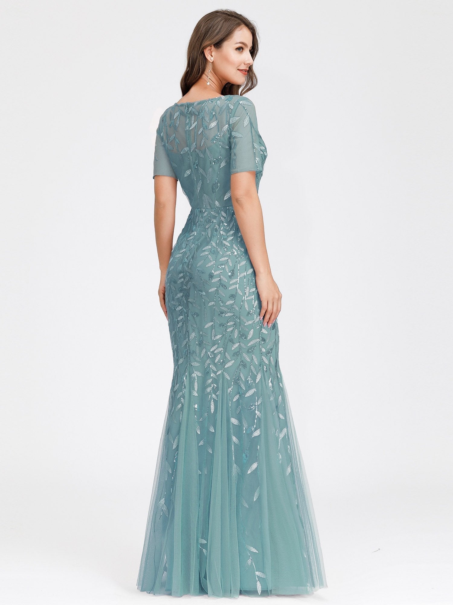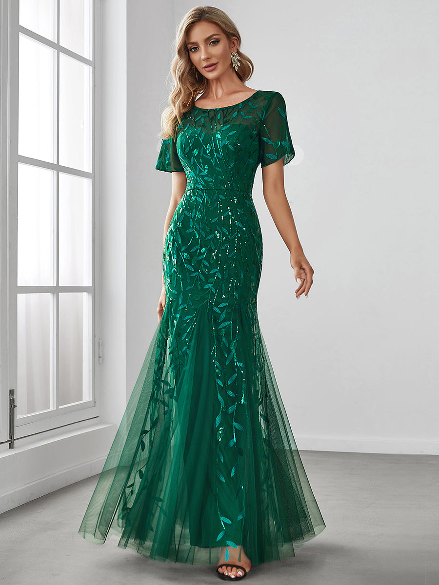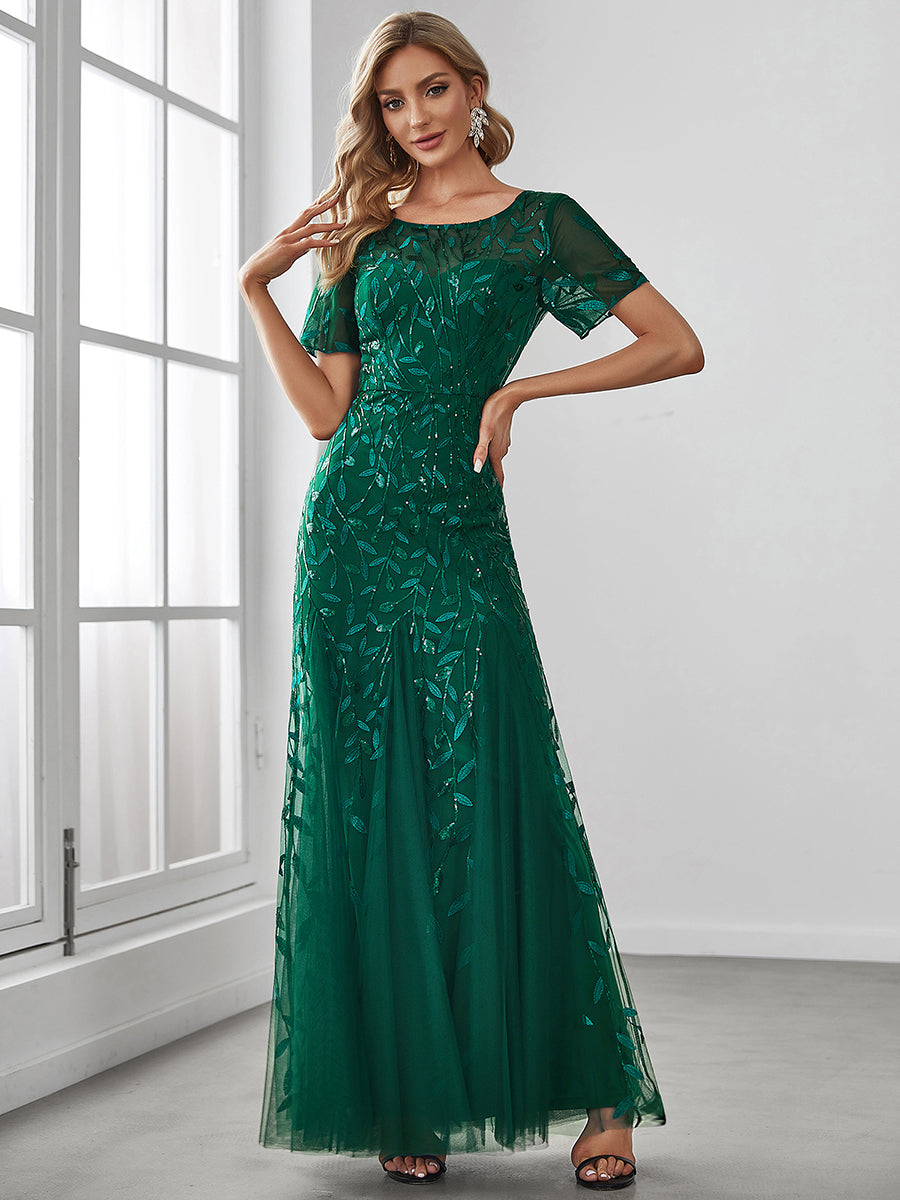 This gorgeous sequined tulle dress oozes romance with its shimmery leave design and a sheer round neckline. It is a perfect choice for people who are looking for an elegant look, but its delicate details add just enough flair to show your taste. Suit for evening party, cocktail, prom, graduation, weddings, and any other formal affair!