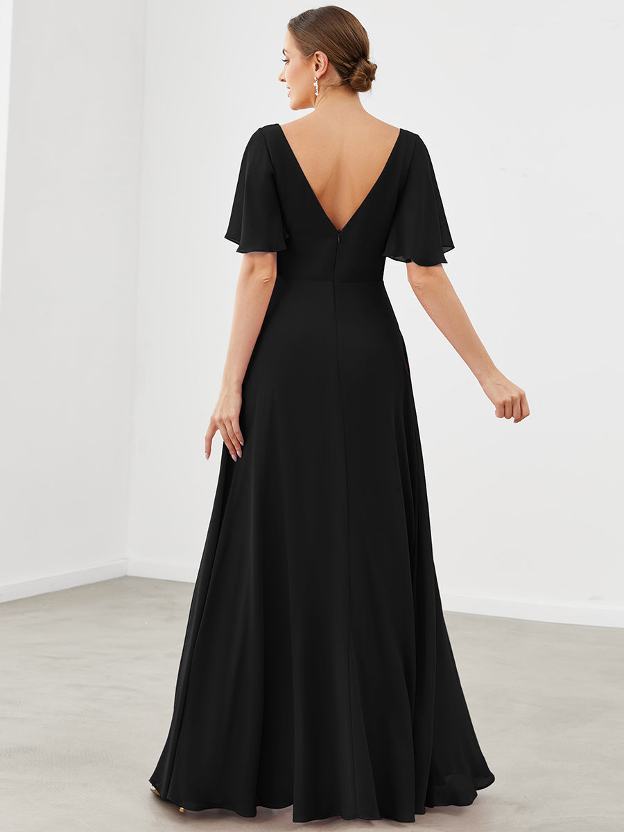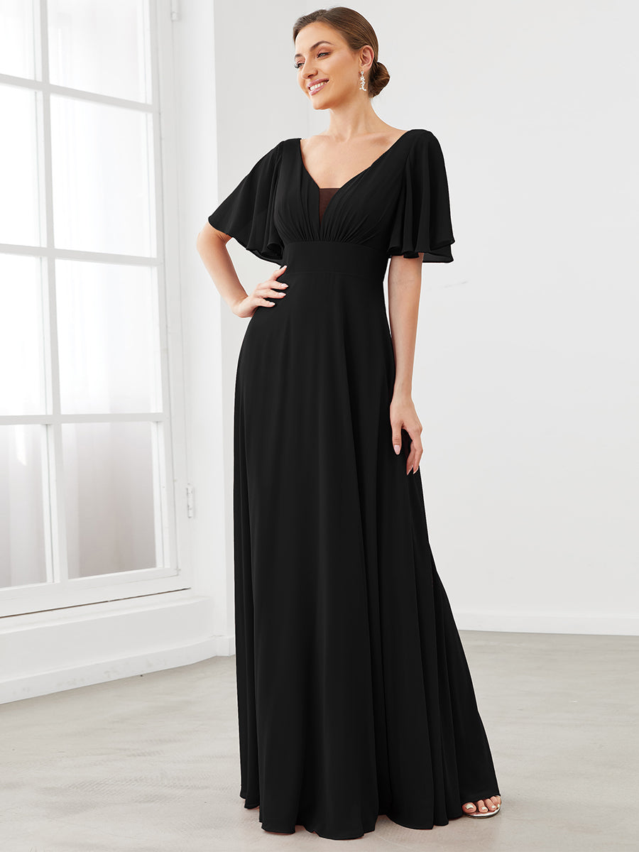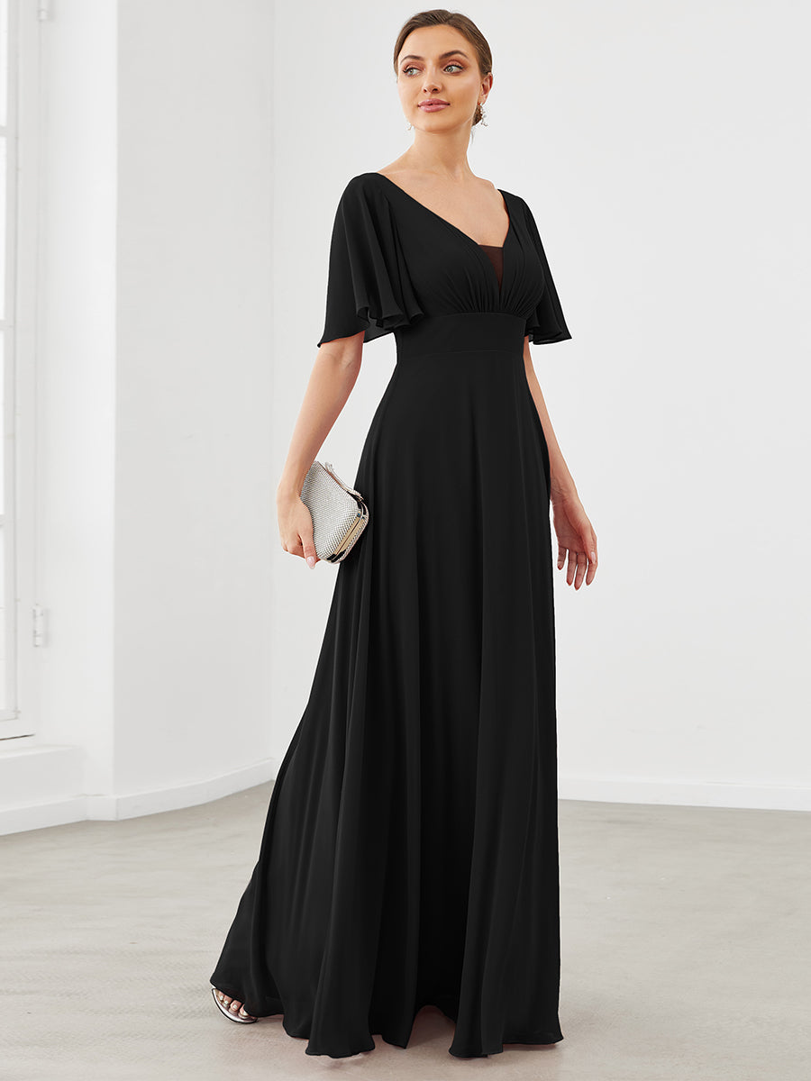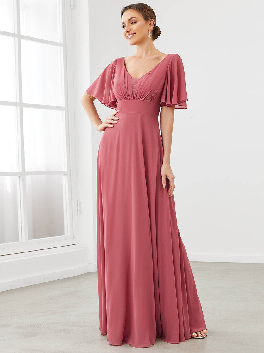 If you are having trouble to find a perfect bridesmaid dress, then here it is. It features short ruffles sleeves, deep V-neck, A-line silhouette, and pleated decorations.