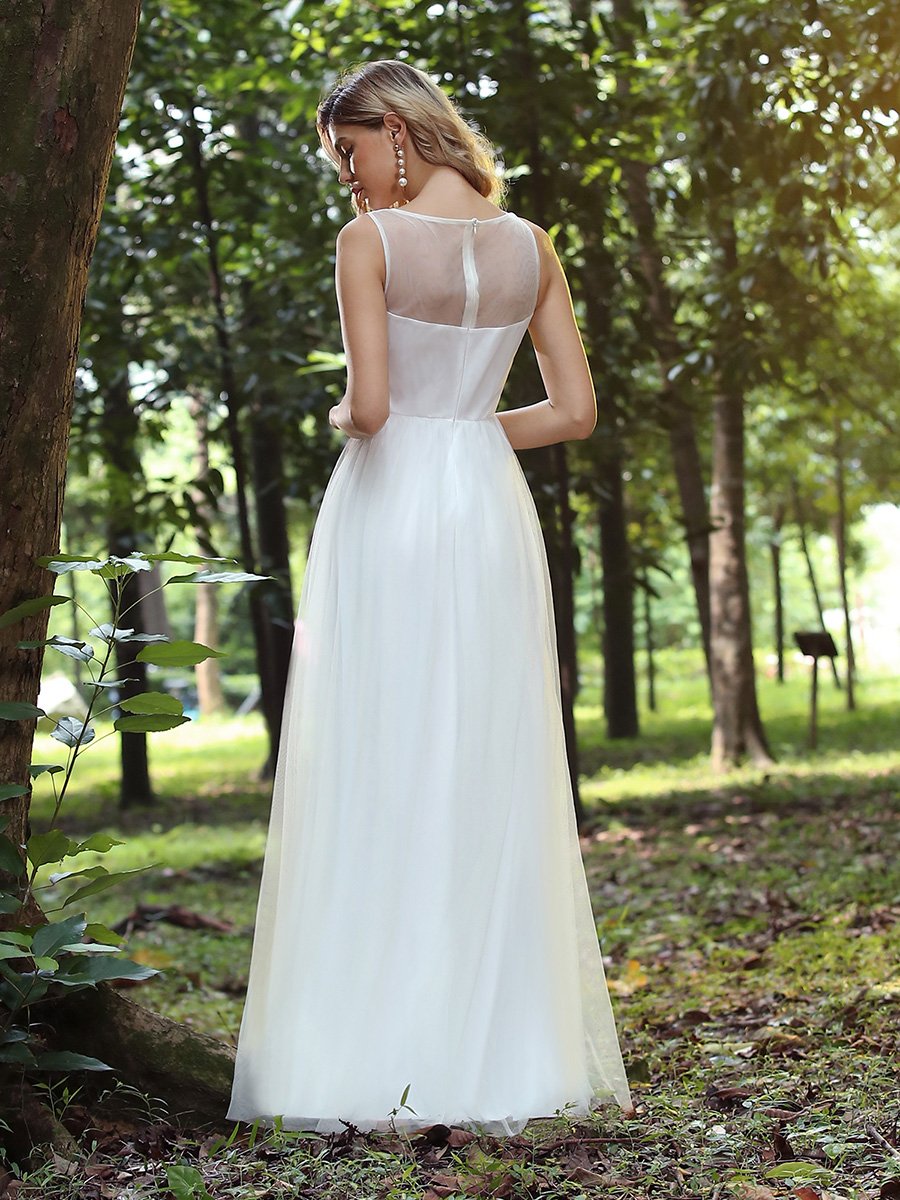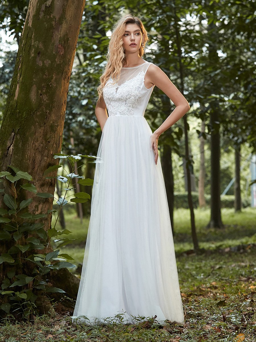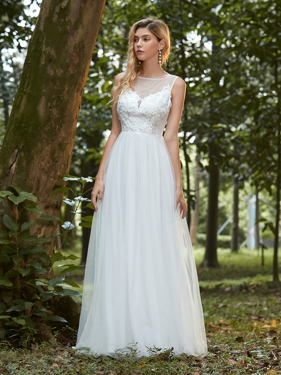 Featuring a classic sheer round neckline and a flowy tulle skirt, this romantic wholesale bridesmaid dress is perfect for any wedding in spring and summer. The delicate applique in the bust also gives a feminine and elegant vibe.