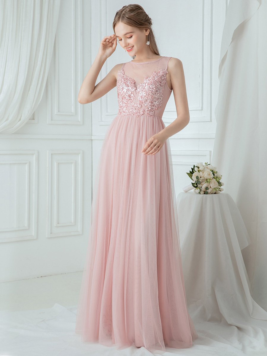 Elegant See Through Round Neck Tulle Applique Wholesale Bridesmaid Dress