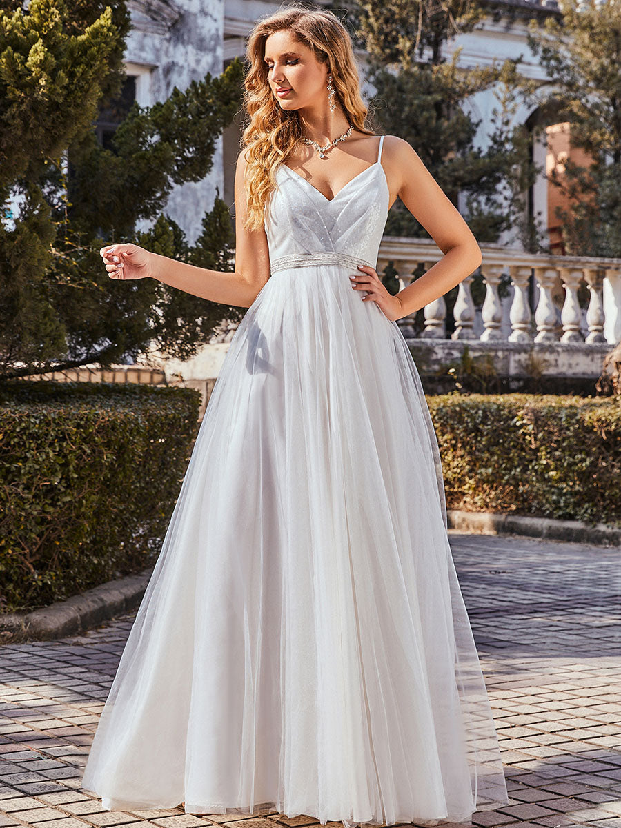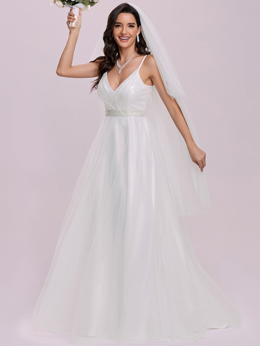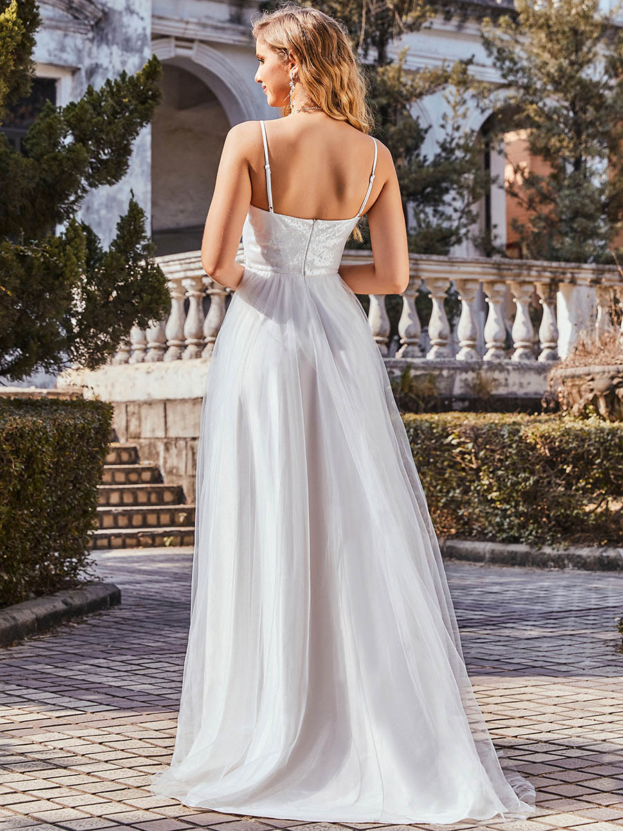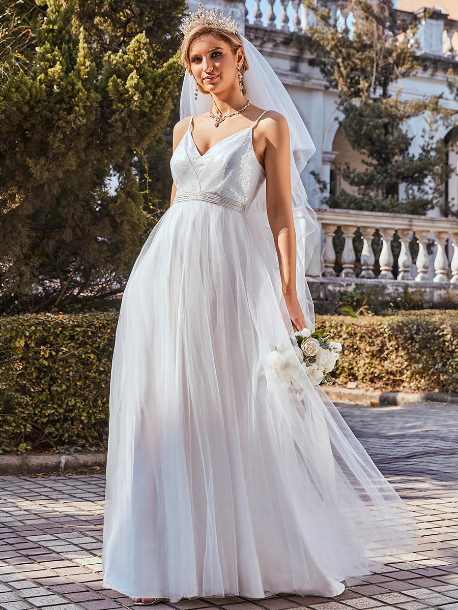 This adorable wedding dress is so remarkable and we can easily say that no other wedding dress like this is available in other shops. The dress features a deep V-neck, spaghetti straps, and paillette on the upper part of dress. The A-line silhouette and bead decoration on the waistline also makes the dress worth buying.