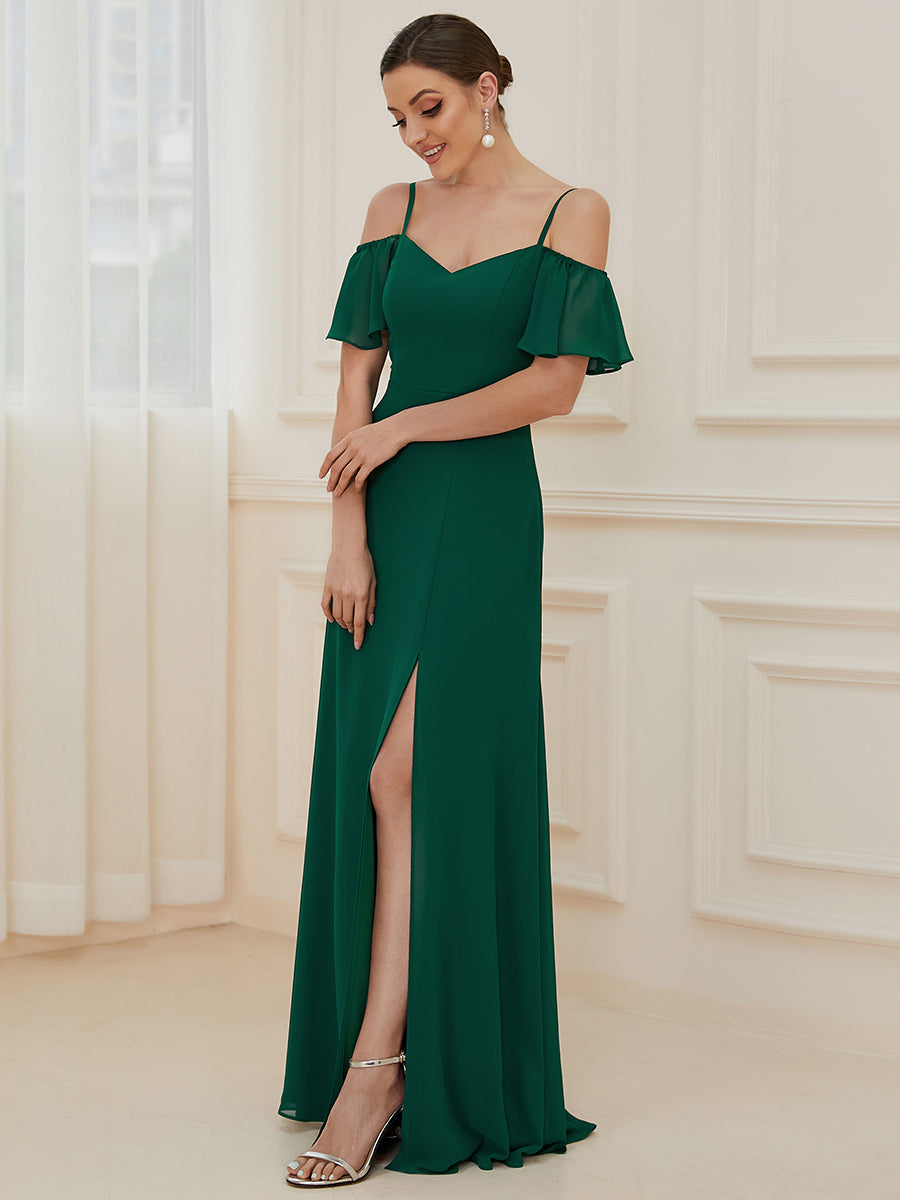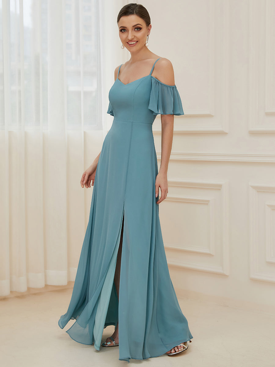 Look like a princess by simply wearing this flattering bridesmaid dress. This bridesmaid dress has a great style as it includes short flare sleeves, deep V neck and A-line silhouette. The split design also adds glamour to the style.