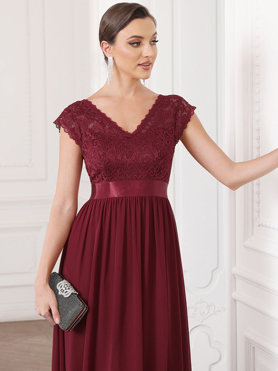 Make beautiful memories in this gorgeous bridesmaid dress. This stunning dress features a deep V-neck, cover sleeves, and an A-line silhouette.