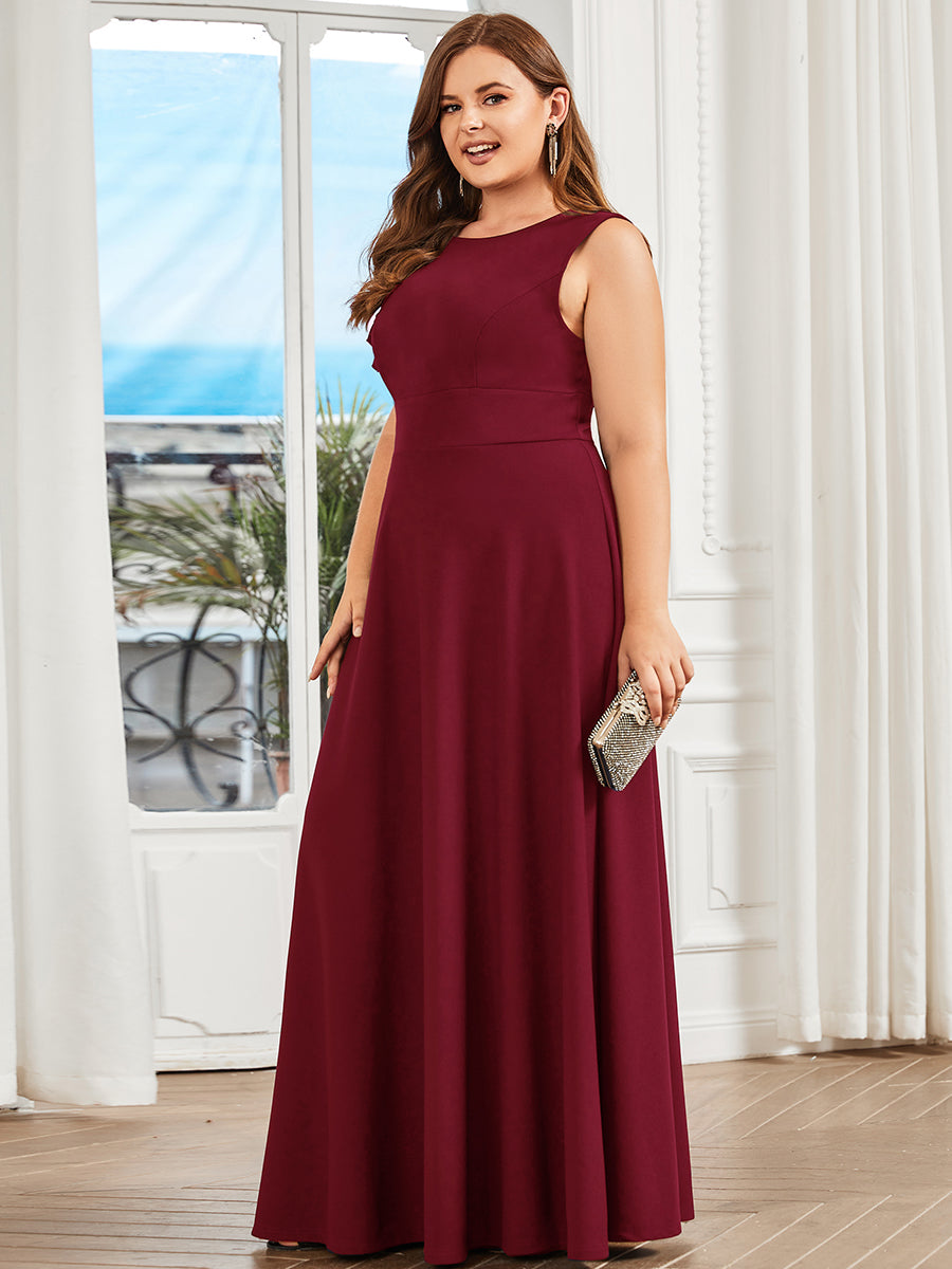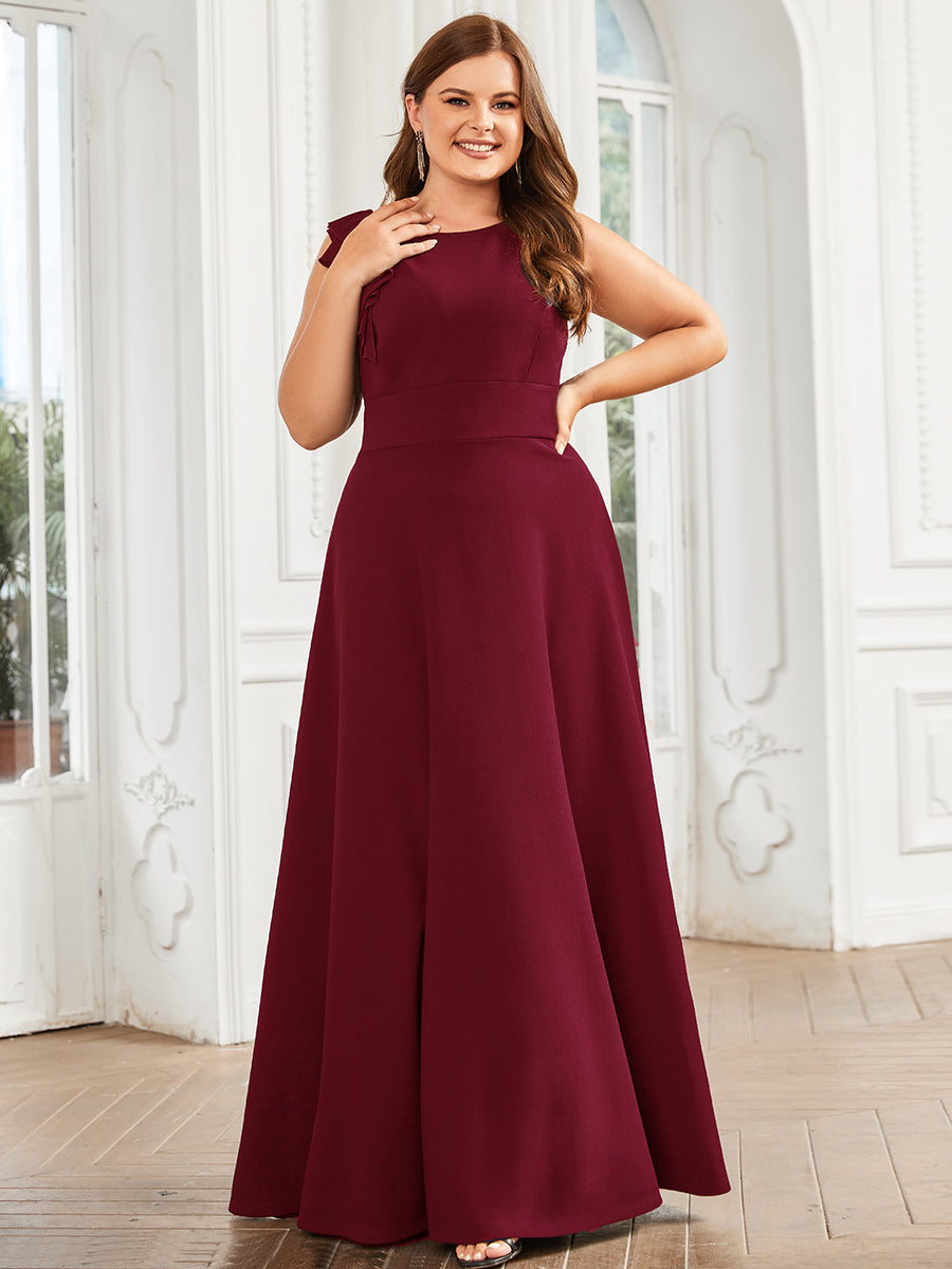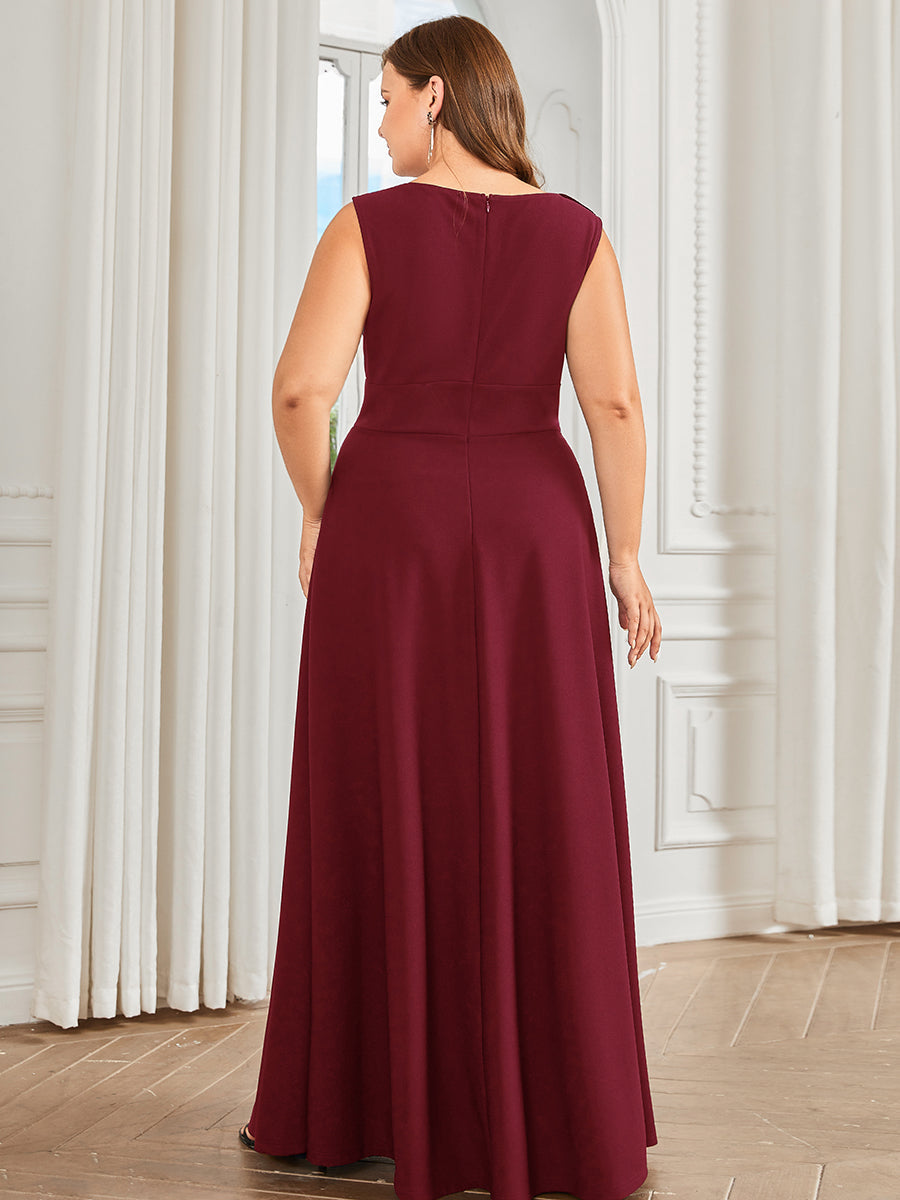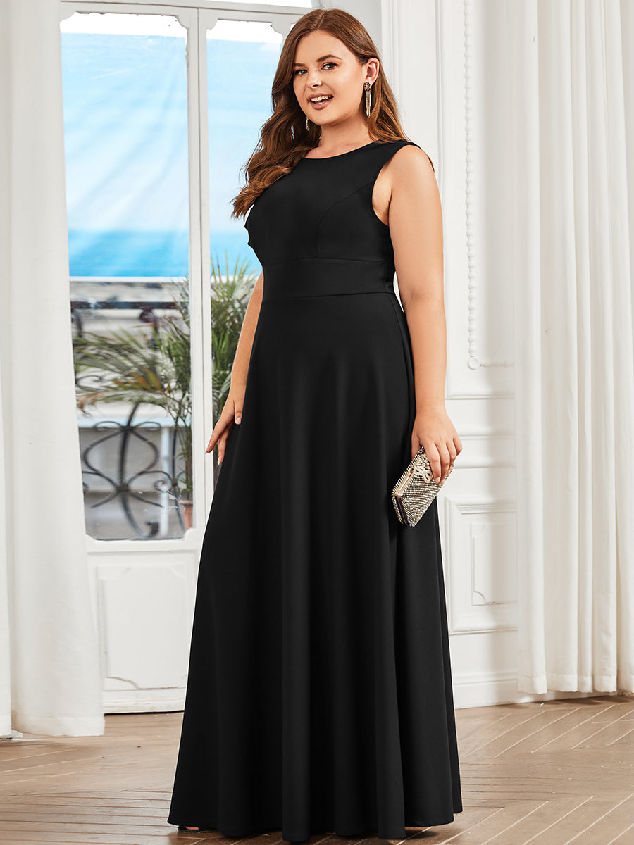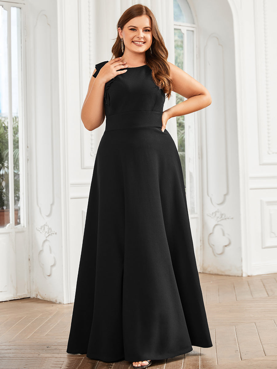 Make your evenings more beautiful by wearing this plus evening dress. This sleeveless dress has a round neck, floor-length, an A-line silhouette, and a lotus leaf.
