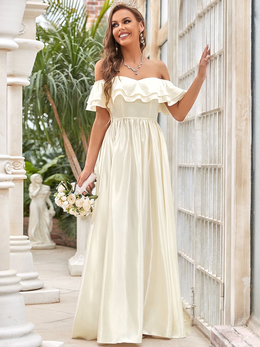 This full-length wedding dress features romantic off-shoulders, A-line silhouette and 3/4 ruffle sleeves. This wedding dress is quite simple but we promise that it will surely make you look like a princess.