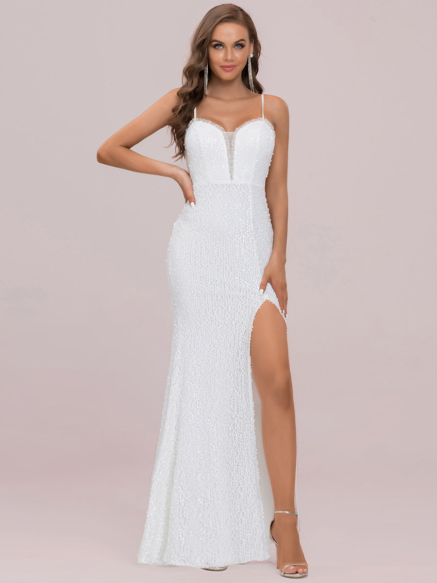 This gorgeous dress features spaghetti straps, fishtail silhouette, and split design. Not to mention the dress has paillette all over it and frill decoration on the neckline. Buy this dress now.