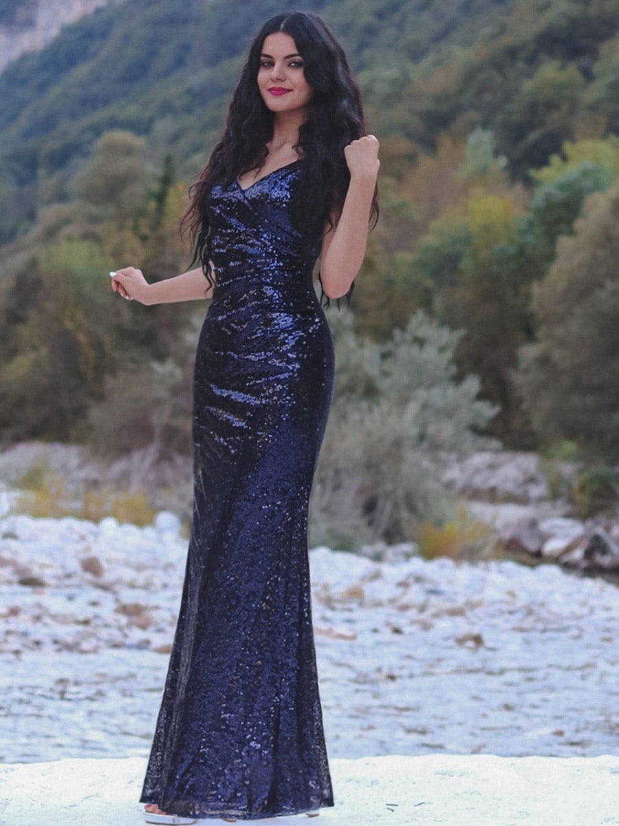 Show up to your next formal event in this show-stopping dress! Allover sequins and a figure-flattering ruched waist make this backless wholesale sequin dress a must-have! This sequin dress is perfect for all formal occasions, from evening party, cocktail, weddings to prom, homecoming, and graduation!