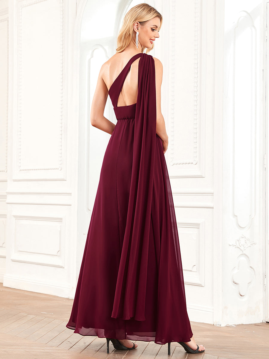 Look magical and stunning by wearing this bridesmaid dress. This adorable dress is designed with one-shoulder, and an A-line silhouette. It is sleeveless as well.