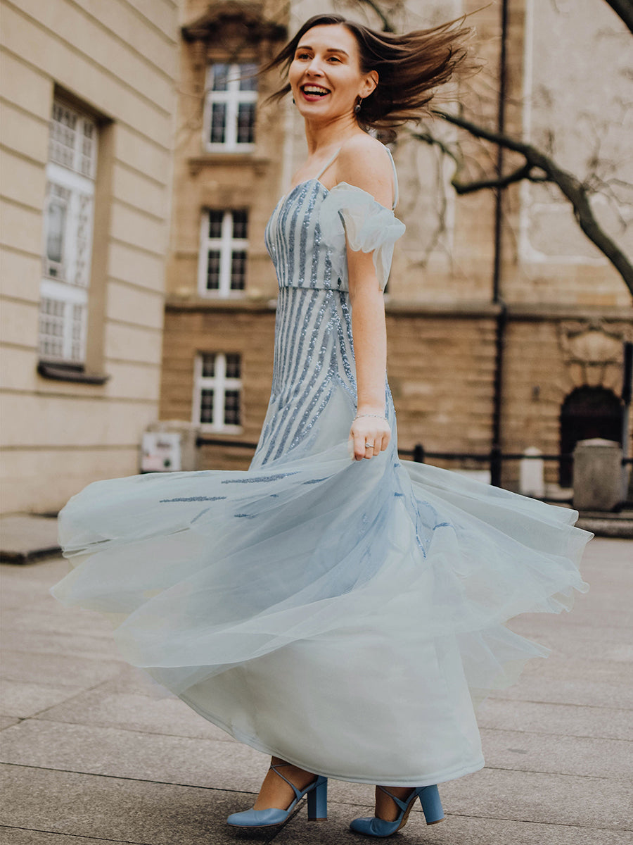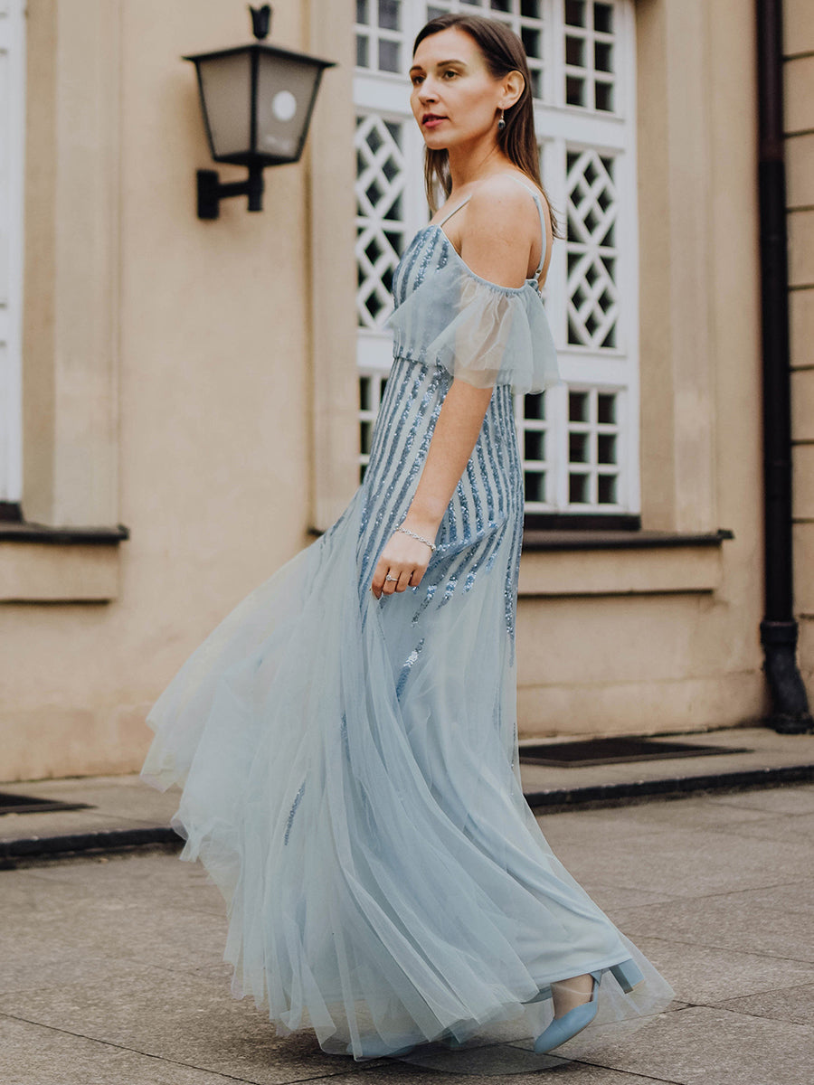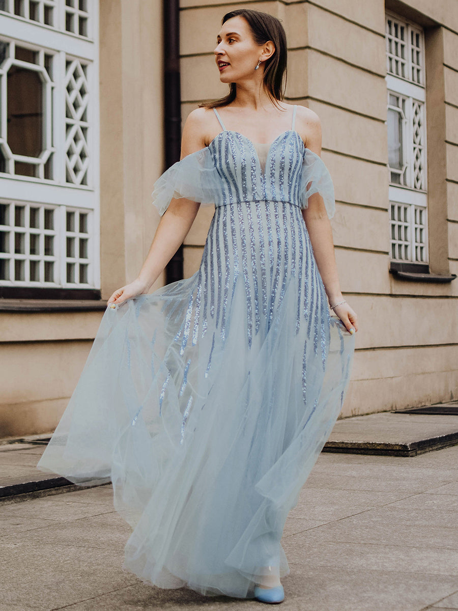 This cute and adorable floor-length evening dress is a must-buy. The dress features a plunging V-neck, spaghetti straps, off-shoulders and an A-line silhouette. The lining is decorated with pillatte that looks gorgeous.