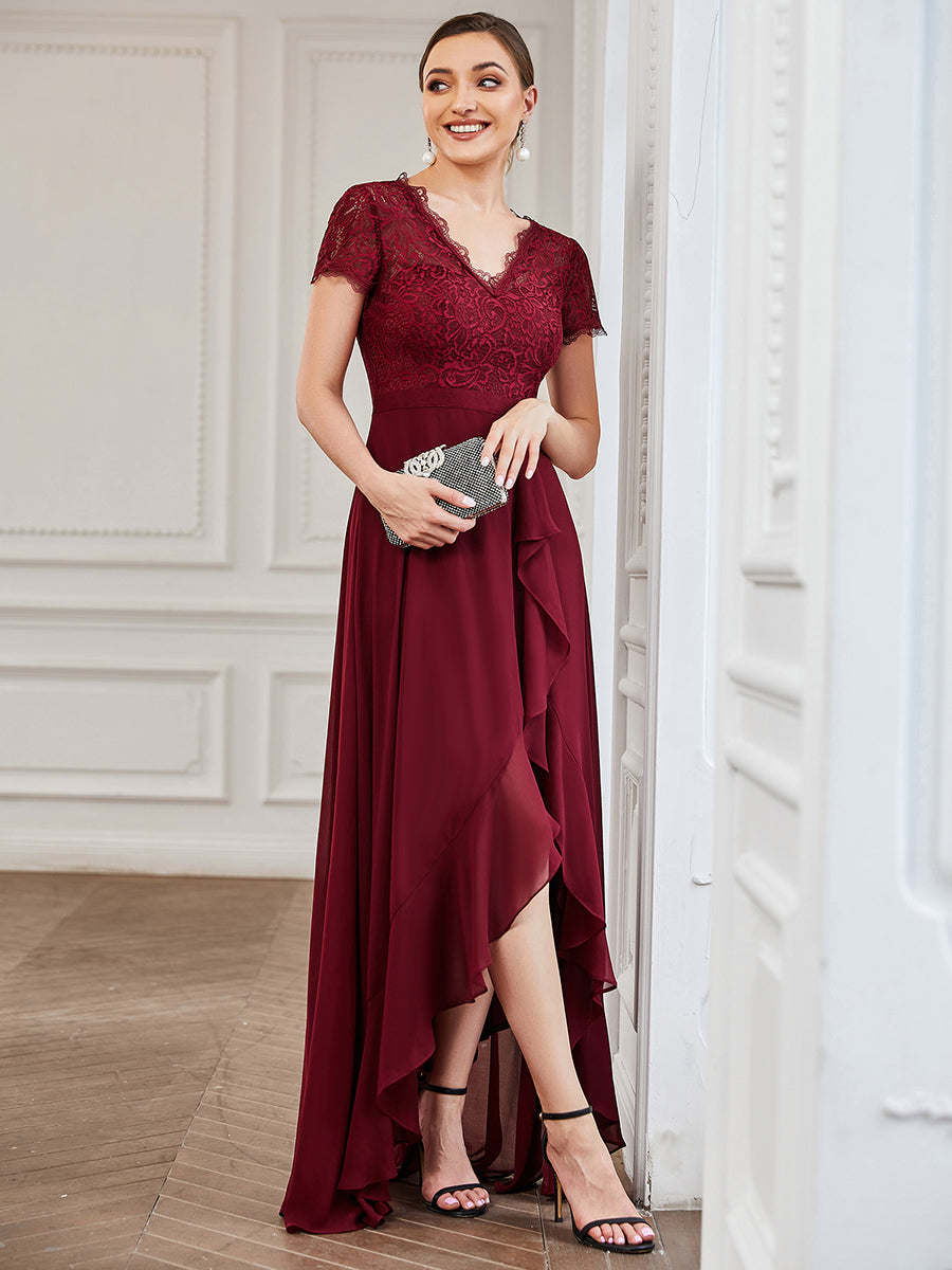 V Neck Short Sleeves Asymmetrical Hem Wholesale Bridesmaid Dresses