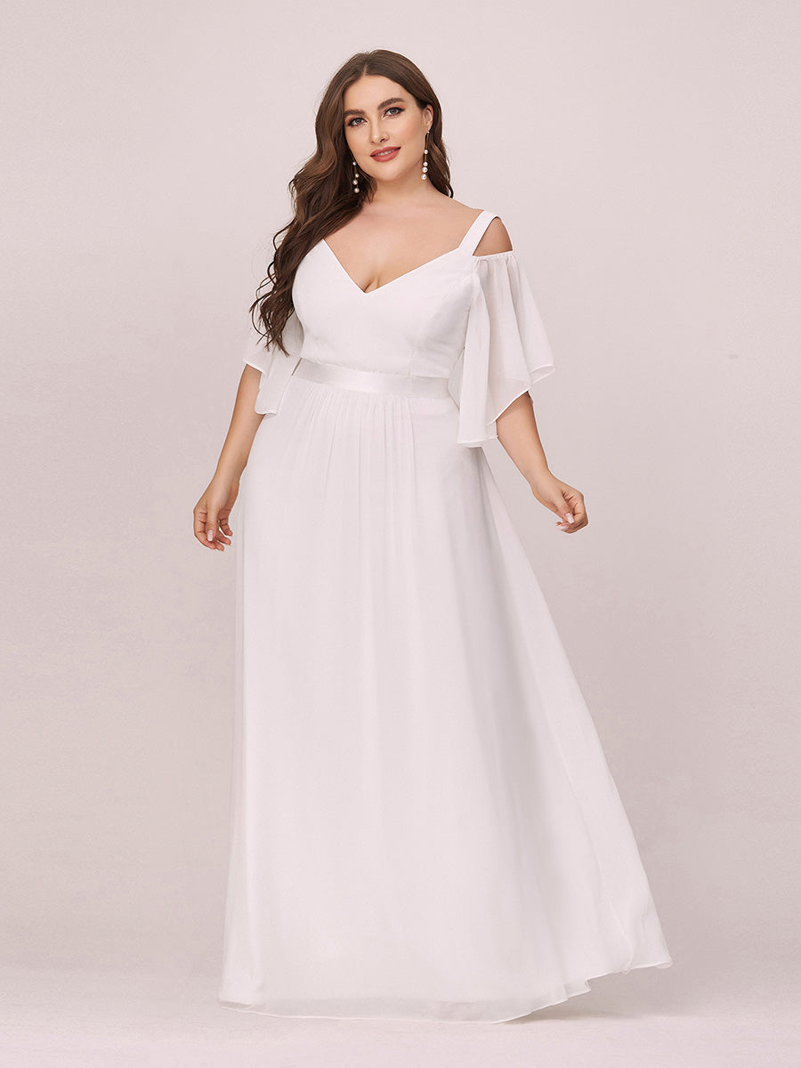 This romantic wholesale plus size bridesmaid dress features a sexy off the shoulder neckline, empire waist, flutter sleeves, and belt design. The shoulder straps are unadjustable. Suitable for evening party, cocktail, prom, homecoming, graduation, weddings, and any other formal affair!