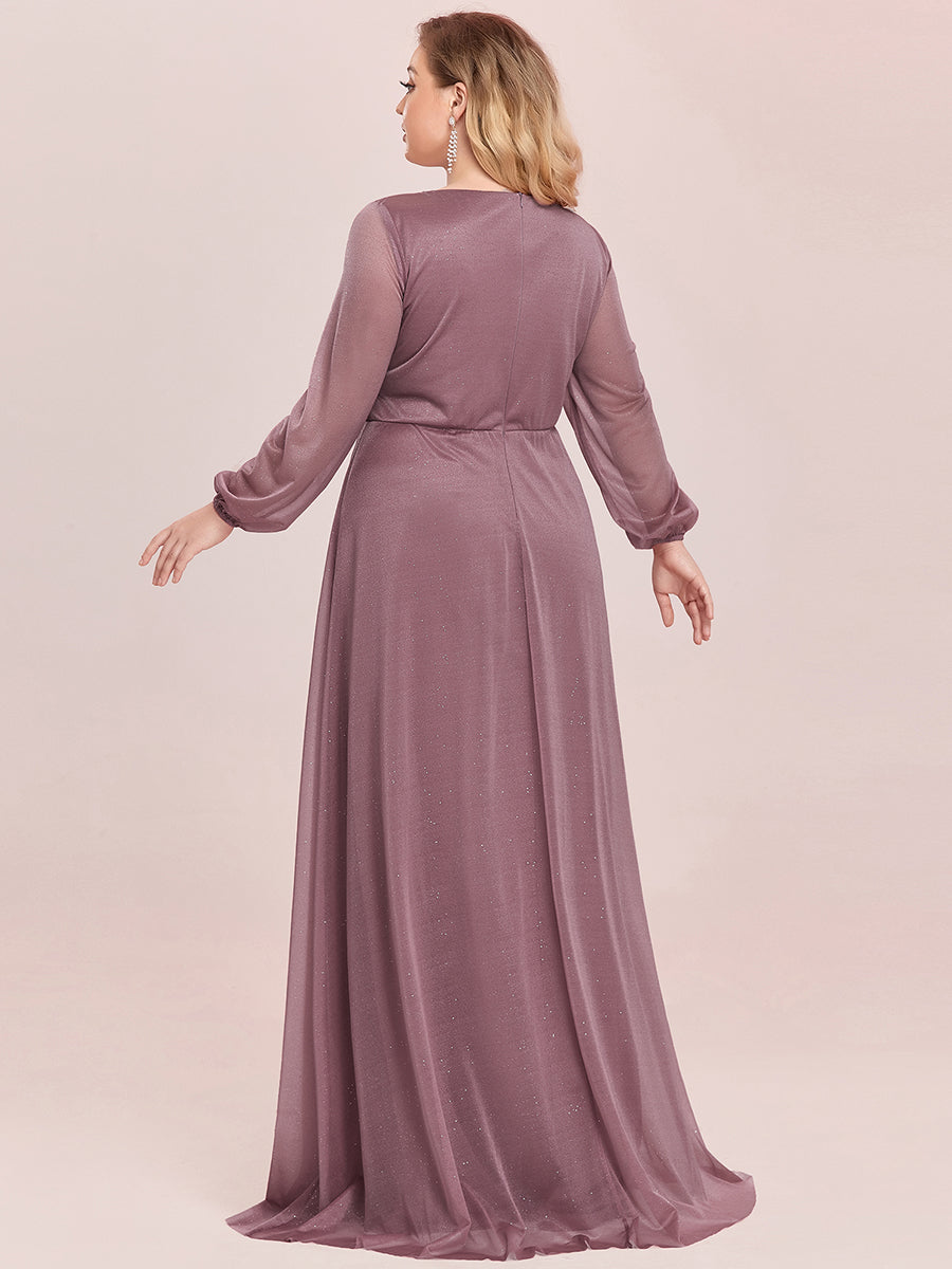 Featuring a deep V neckline, long puff sleeves, and a thigh-high slit, this shimmery plus size wholesale evening dress is both sexy and elegant. The delicate ruching in the waist creates a figure-flattering silhouette. Suit for evening, party, cocktail, prom , homecoming, graduation, weddings!