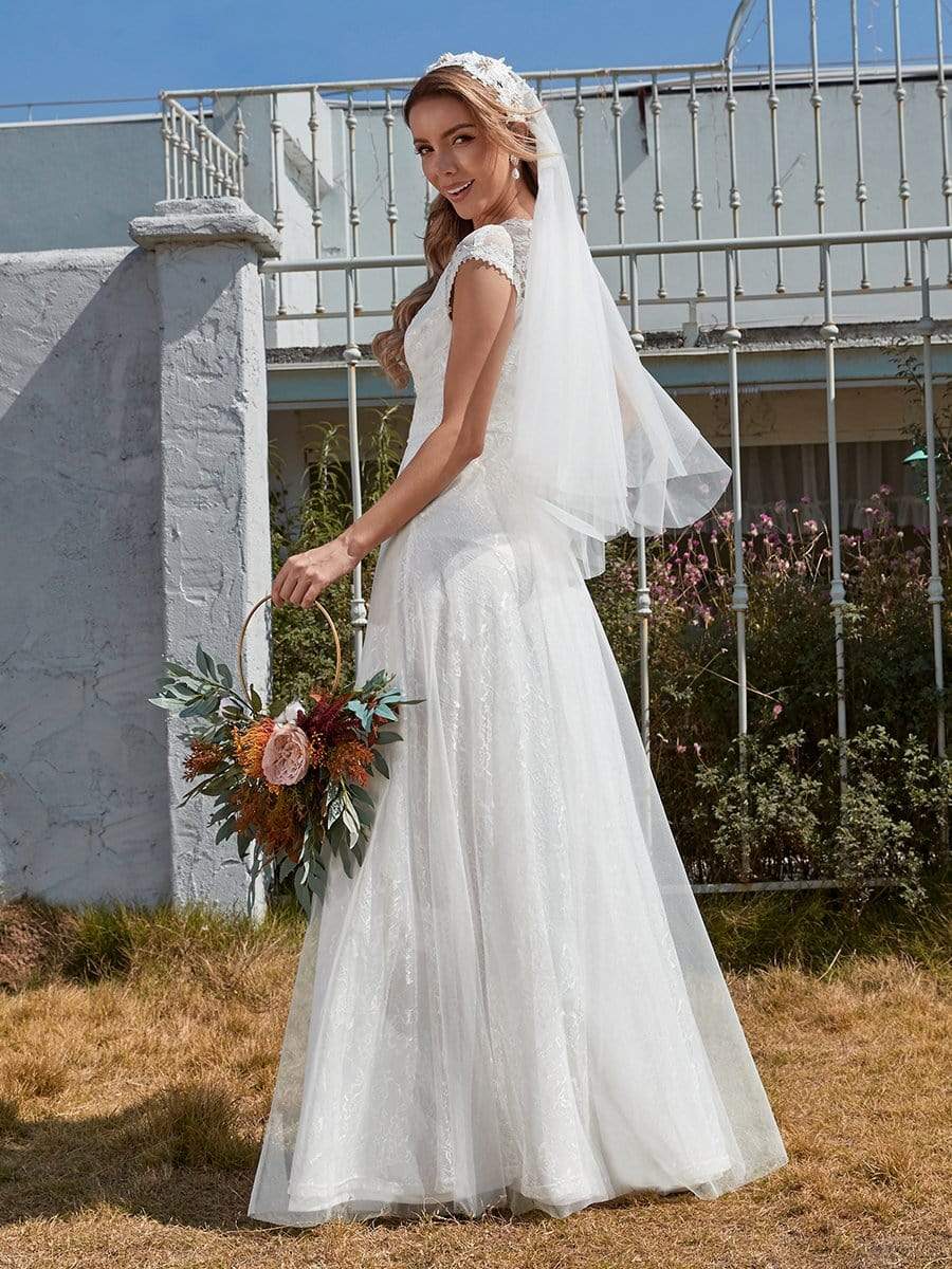 With such a classic silhouette, you can't go wrong with this simple lace wedding dress for beach elopement. Featuring a flattering V neckline and delicate cap sleeves, this gown will show off your figure to its best advantage. The skirt of this simple V neck wedding dress is a delicate lace layered over with flowing tulle, which will have you feeling every bit the blushing bride.