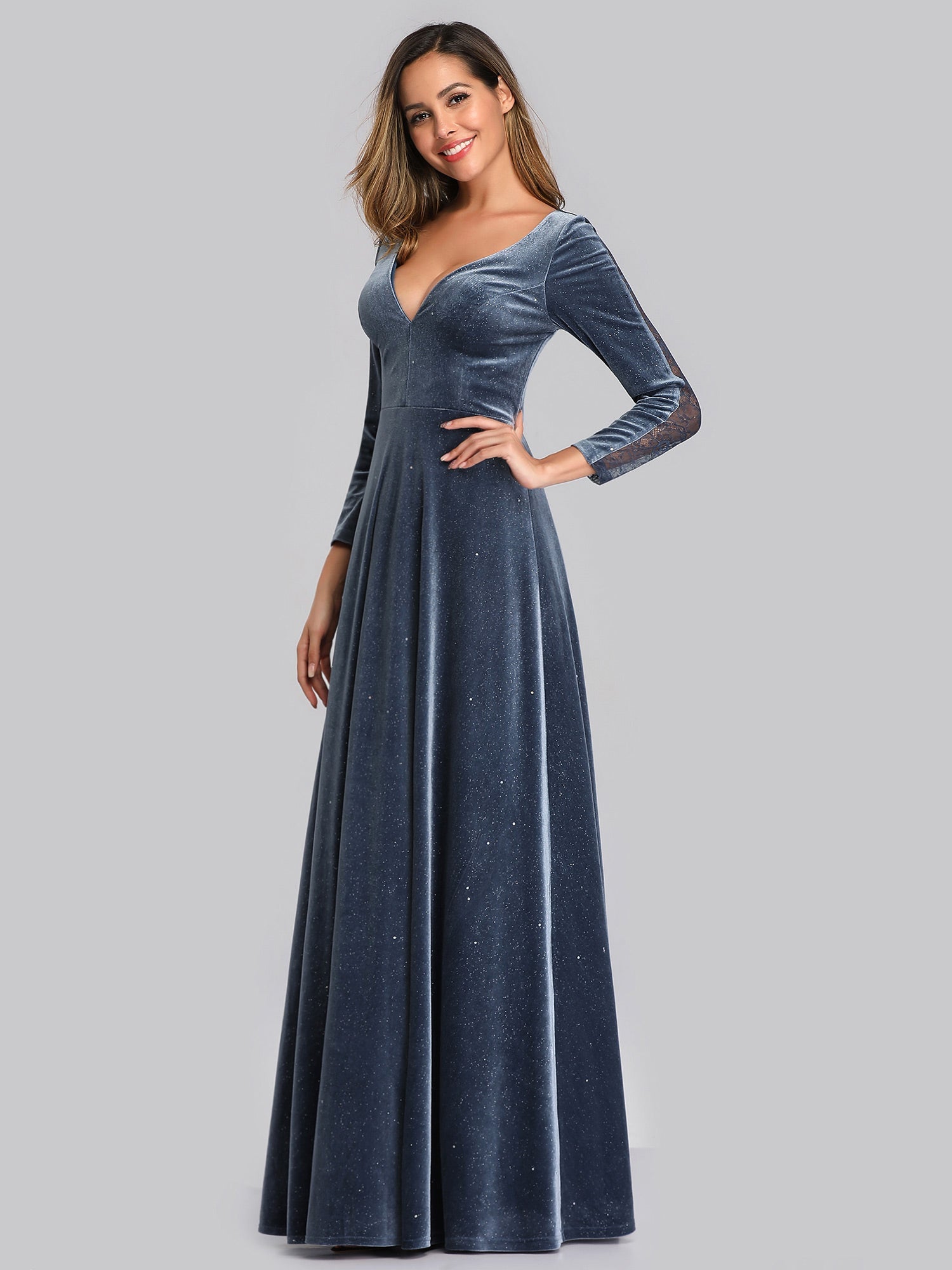 Women's V-Neck Floor Length Velvet Prom Dresses With Long Sleeve